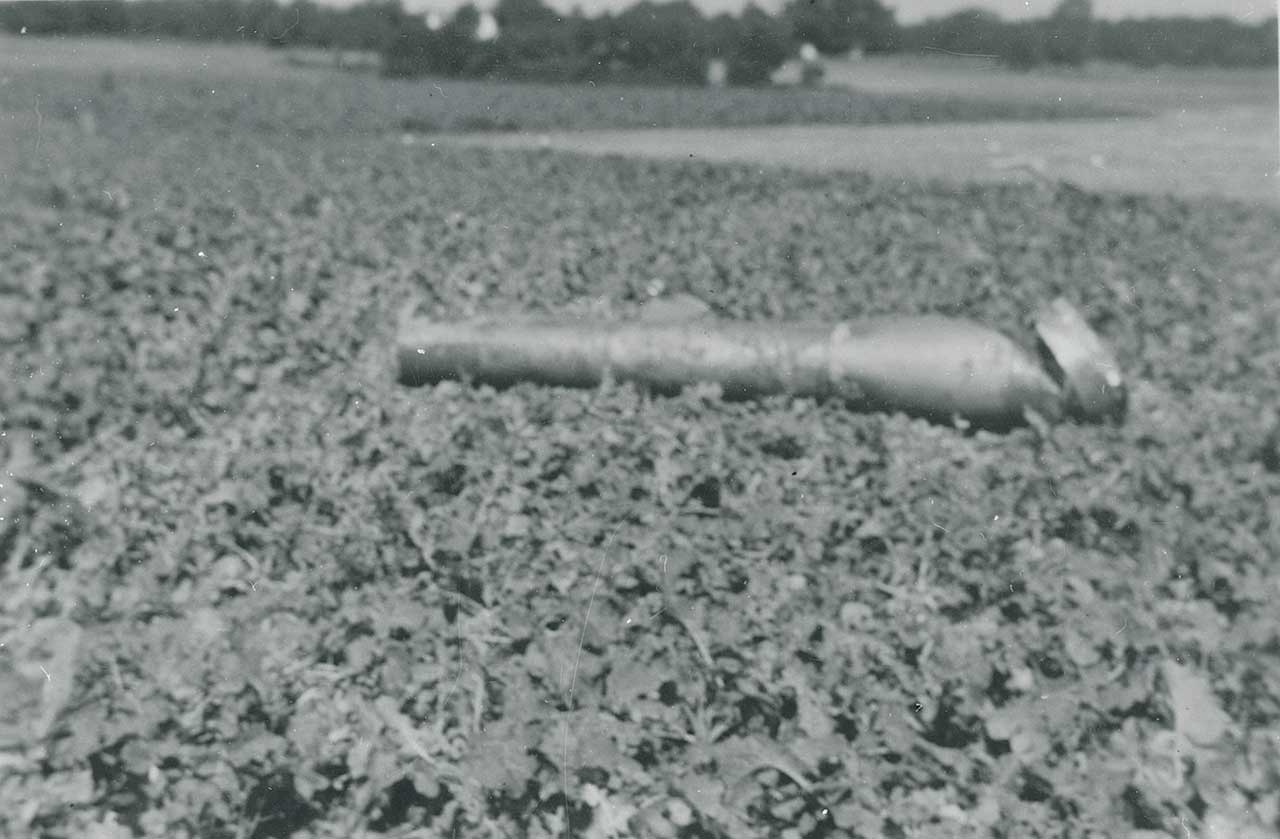 Foto taget af den nedstyrtede V-1 bombe på en mark ved Bodilsker på Bornholm d. 22. august 1943.
