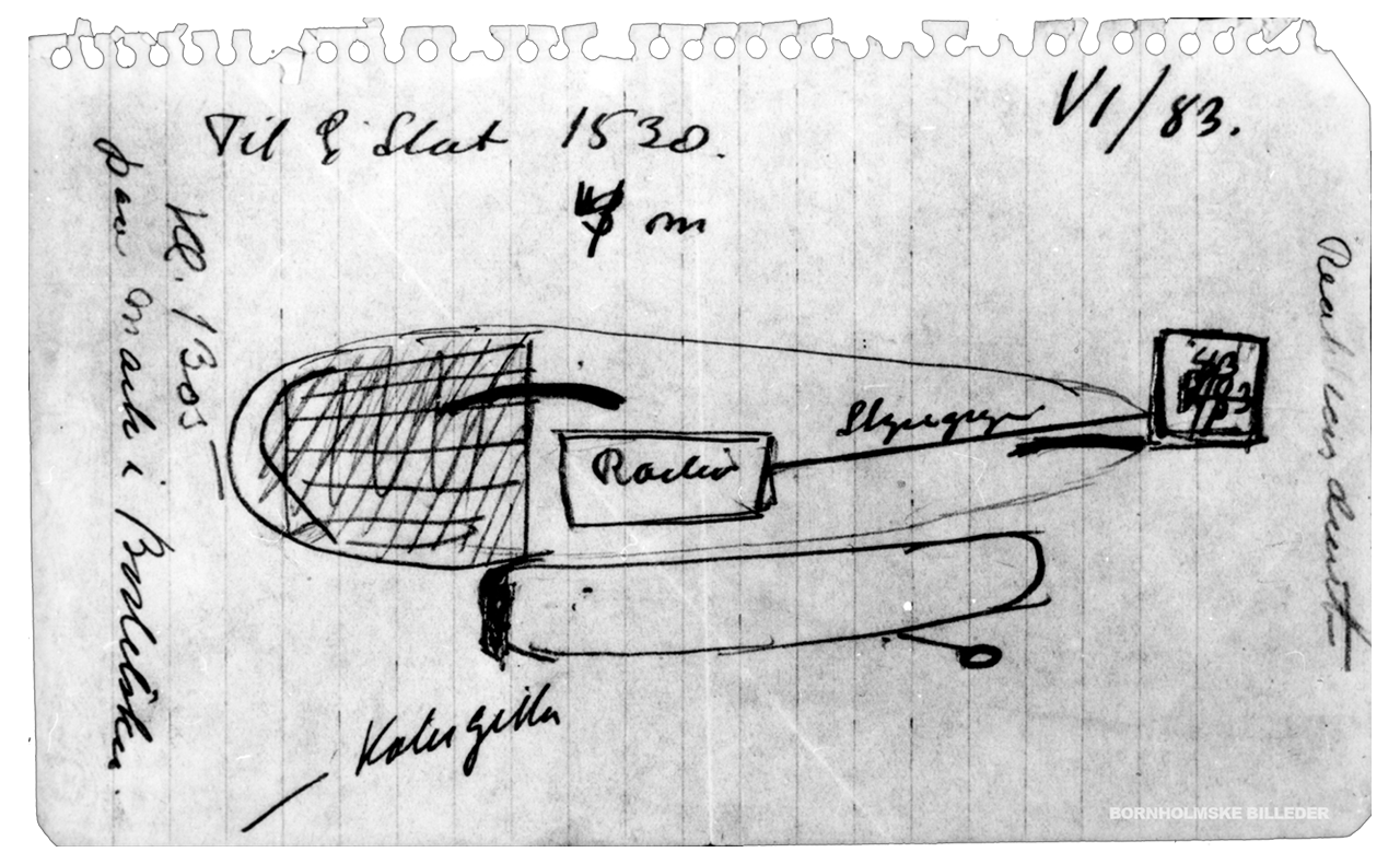 Hassager Christiansens tegning af V-1 bombet ved Bodilsker