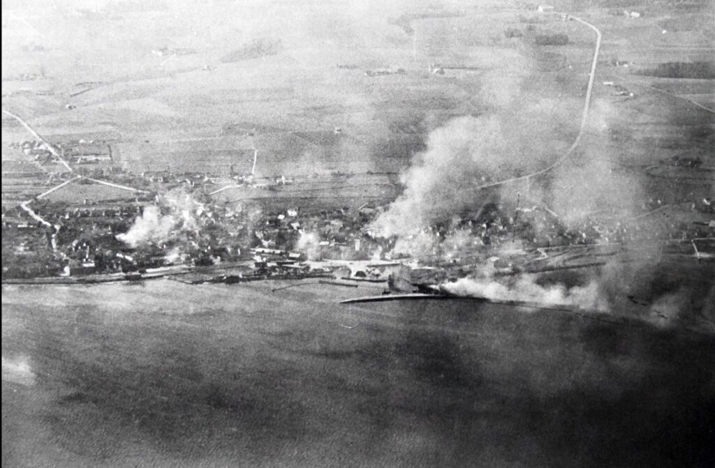 Foto fra svensk rekognosceringsfly af Nexø der brænder efter det russiske bombeangreb den 8. maj 1945